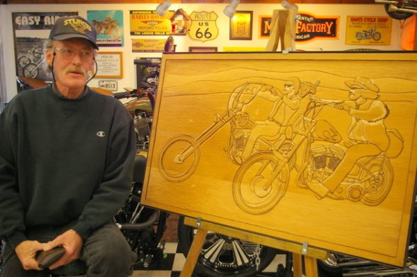 RIDE-CT.com caught up with Smith at Doc’s Motorcycle Parts in Waterbury where he was showing off the 48-inch by 30-inch carving that began as four separate pieces of five quarter pine. They’re connected with 12 dowels and secured by a welded frame.
