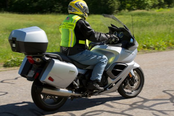 The similarity between dating and demoing a bike came to mind more than a week ago weekend while riding a new 2013 Triumph Trophy SE, which was loaned by the manufacturer. The introduction was indeed awkward. The setting wasn’t a dimly-lighted bar, rather Mark’s Motorsports in Enfield. After filling out the paperwork, I waited while a tech re-mapped the engine (the motorcycle equivalent of going to the powder room to apply fresh makeup). The bike was then rolled outside so that I could be given a quick tutorial.