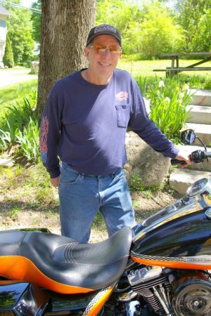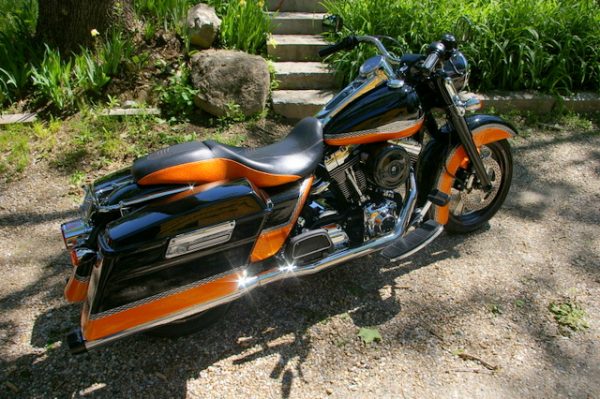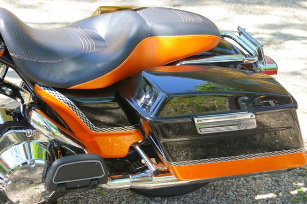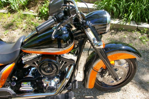 The article written by Bud Wilkinson, of Ride-CT.com is hugely fabricated. The previous owner Rocco, purchased this bike in 2002 and sold it to Chris, in 2012. Everything you read in the article and see on the bike was NOT designed by the new owner, pictured, Chris Rasile. All of the assembly work was in fact, done by Daddio, in Stamford. Pirate Upholstery had nothing to do with the seat, it was done in Myrtle Beach, as per Rocco’s request, by a husband and wife team. Roade Studio did paint the bike from a design Rocco suggested, starting with the HD Sprint emblem and finishing with the checker-board design separating the black and orange colors. All of the motor work was done in Rhode Island by a long time motor builder, the name escapes me at this time, 106 HP-110 ft lbs torque. Next time, get the FACTS straight!