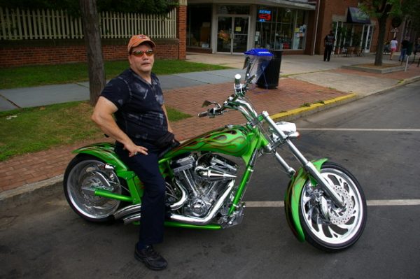 Richard Hester of Milford was an early arrival on his bright green 2004 American Iron Horse Slammer. He wasn’t able to ride it to last year’s event because it was in the shop, but he did today.