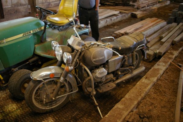 It’s becoming a weekly habit to snap pictures of interesting bikes seen along the road each Sunday and then post them that night. Saw a couple of Italian beauties today, although one was stashed in a former cow barn on a hilltop in Cornwall and covered with dust and bird shit.