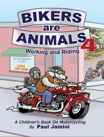 1-23_FEA_112313BW02So, in an effort to boost the website’s Facebook profile, we’re launching a one-week contest with a copy of artist and author Paul Jamiol’s new children’s book “Bikers Are Animals 4” as the prize.