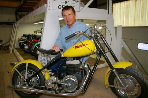 Today, Mustang Seats founder Al Simmons agreed to loan a 1953 Mustang Special so folks will be able to get a good look at the pint-sized bike that was produced in California from the end of World War II to the mid-1960s. Simmons collects Mustangs. Here’s a shot of him taken earlier this year with one of the Mustangs.