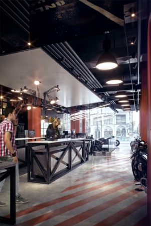 The new two-level store will feature an 11,500-square foot showroom, a coffee bar (pictured below), a 16-monitor display wall, and a “dynamic glass bike lift” suspended from the ceiling.