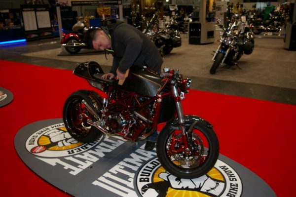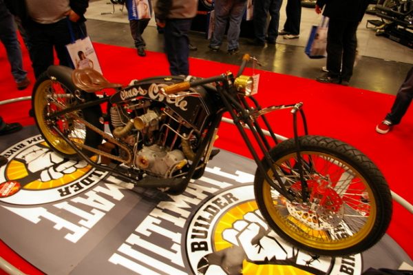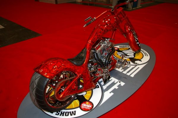 NEW YORK – There’s a show within the show at the Progressive International Motorcycle Show this weekend and at every stop on the IMS circuit. Bike builders from across the nation are competing for a $90,000 cash prize as part of the Ultimate Builder Custom Bike Show. Their unique machines are displayed along the red-carpeted main aisles on the exhibit hall floor, and they represent all styles of bikes. Here are some samples: