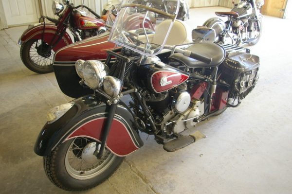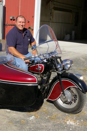 Dennis Bolduc’s 1946 Indian Chief with sidecar sits in front of a 1941 Indian Four (left rear) and a 1953 Indian Chief (right rear) inside what will eventually be the showroom of Indian Motorcycle of Westfield in Westfield, MA.