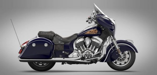 The top-end Indian has cast wheels, a seat height of 26 inches and weighs in at 848 pounds when filled with gas. It will be available in three colors – black, red or blue. Standard equipment includs ABS, cruise control, driving lights, keyless start, power windshield, remote locking hard saddle bags, tire pressure monitoring and a 100-watt stereo with Bluetooth and smart phone capability. Base MSRP is $22,999.