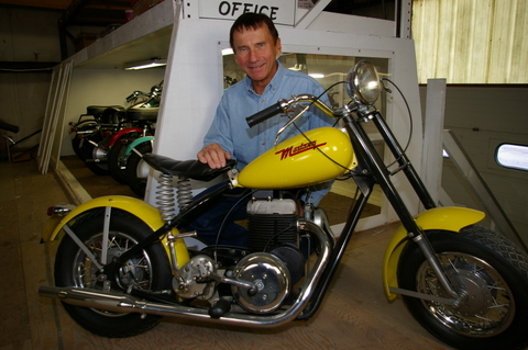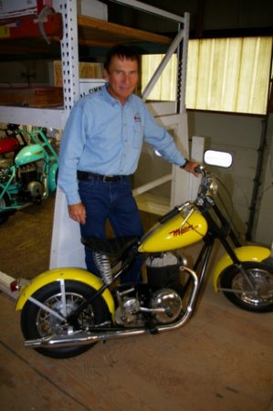 Simmons is the founder of Mustang Motorcycle Products, maker of the well-known aftermarket Mustang Seats for cruisers. In the entry way of the company’s headquarters, enclosed in a glass case, is a bright red Mustang motorcycle. Across the parking lot is the warehouse that contains his collection.