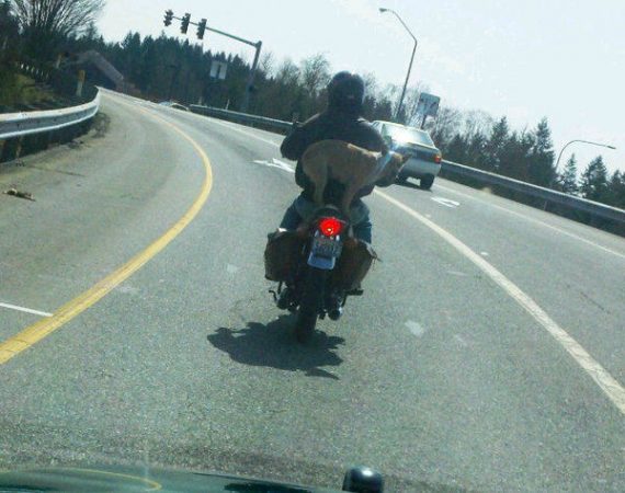 KCPQ-TV in Seattle has the story here, but the picture from the Washington State Patrol is worth a thousand words. All it would take is one pothole or one quick swerve and the pooch would be roadkill.