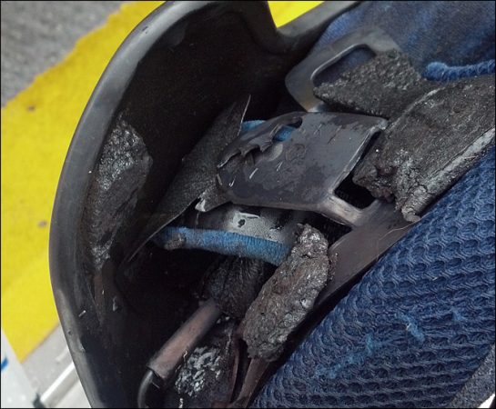 Video can be seen here. The picture of the fried helmet is courtesy of the Washington State Patrol.