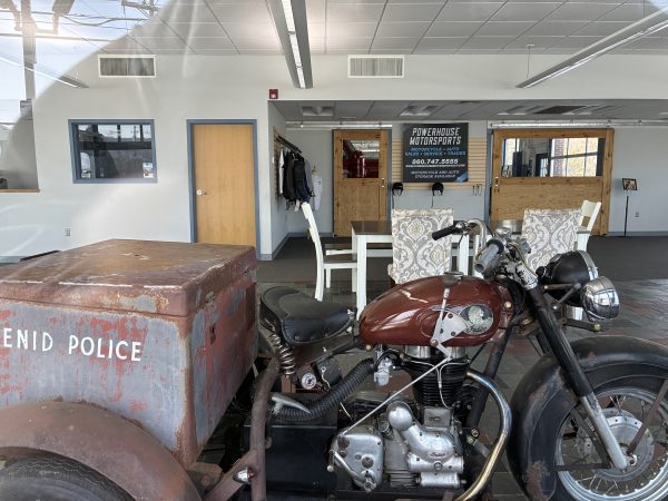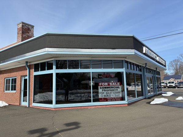 PLAINVILLE, CT – The showroom at used motorcycle dealer and repair shop Powerhouse Motorsports at 151 East Street in Plainville stands empty, except for a vintage Indian police trike, a few motorcycle jackets hanging on a rack and a table surrounded by chairs. A large paper sign hanging in the window declares “Commercial Property For Sale/Lease.”