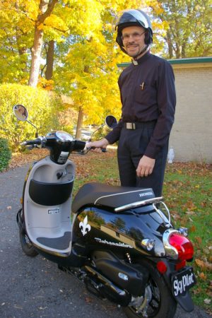 How do his parishioners regard his new mode of travel? “Most of them like it. One person does not like the idea. He refers to the scooter as a ‘donorcycle.’ I think that’s because he’s an EMT and he’s seen too much,” said Gregory, who does wear a half-helmet when riding.