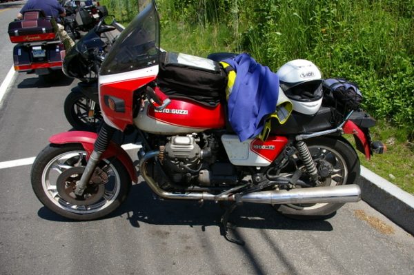 Had to chuckle to when stopping briefly outside the Whistle Stop Cafe in Deep River. Ran into Miguel Balaguero of Salisbury, whom I’d only met last Sunday at Toymaker’s Cafe in Fall’s Village. Last week he was aboard a 1978 Bultaco Metralla. This week his ride was a 1986 Moto Guzzi SP1000.