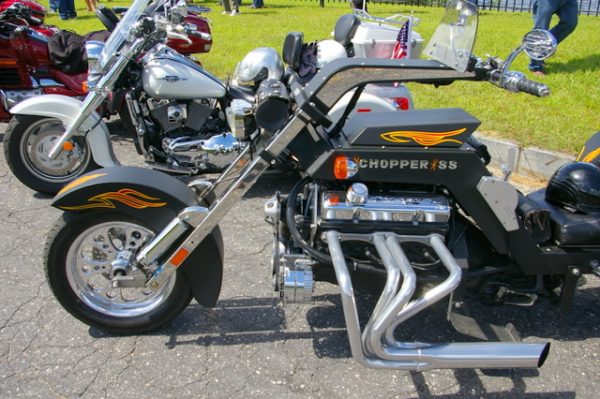 The most eye-catching trike on display today was a 2011 Cheetah Chopper SS with a Chevrolet V* engine (below). It’s owned by Bruce Eastwood (“No relation to Clint.”) of Hannawa Falls, NY.