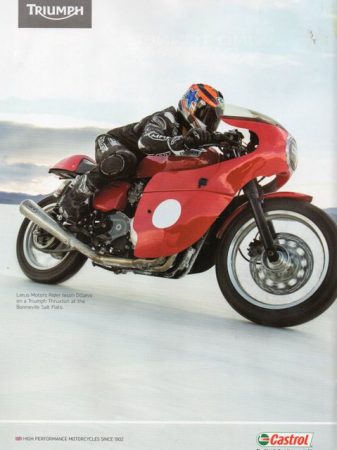 back cover. It shows a customized Thruxton model being ridden on the Bonneville Salt Flats by pro motorcycle racer Jason DiSalvo, its wheels spinning so quickly as to make the spokes invisible. The ad also appears on the back cover of the January issue of “Cycle
