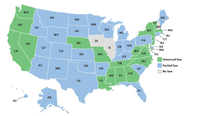 Nationally, 19 states and the District of Columbia have universal helmet laws requiring all riders to wear a helmet. Only three states have no helmet law of any kind. Here’s a map show the laws state-by-state:
