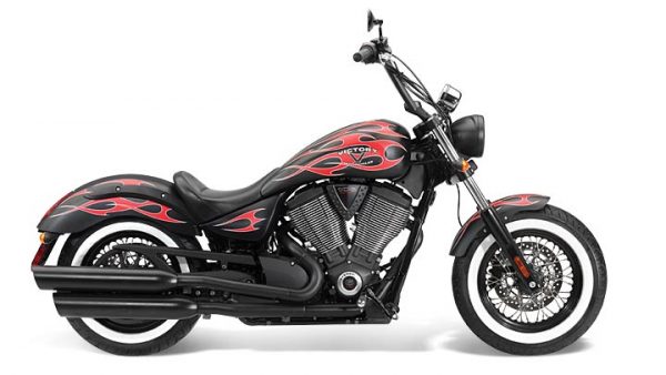 There’s also a second version of Victory High-Ball on the way, with both 2014 models featuring a round headlight. While the black and white High-Ball will have cast wheels and a lower MSRP of $13,499 (down from $14,499), the new black and flames version (pictured below) will have spoke rims.