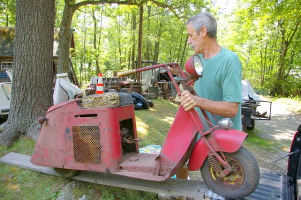 Harley-Davidson golf cart made more than three decades ago when AMF owned the company, and two 1974 Arctic Cat snowmobiles that sit on a trailer. Getting rolled from the bed of his pickup truck this afternoon and added to the collection of detritus was a rust and red Cushman scooter.