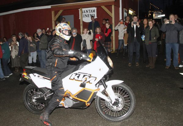 You know that someone’s dedicated rider not only by what they ride, but when they venture out on dreary December day like today. Showing up at the Bantam Cinema late this afternoon for a post-screening Q&A with movie-goers who paid to see “Lincoln” was star Daniel Day-Lewis. He came and went on a 2012 KTM 990 Adventure. The picture is by Jonathan Wilcox of “The Republican-American” and there will be a story in tomorrow morning’s newspaper.