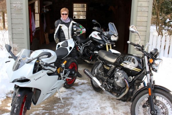 Her newest bike is the Ducati, which she picked up at the end of the November from MotoFIT in Danbury, CT. “I pre-ordered it. I bought it before it was even out. I’ve always loved Ducatis and I wanted a sport bike. It’s not too huge, pretty light, gorgeous,” she said. She’s only put about 300 miles on it and is keeping the revs down until it has more miles on it.
