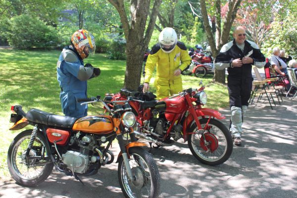 It’s called the Tiddler’s Tour. A group of riders take on 100-mile tour on paved and dirt roads, riding pre-1969, 305cc and smaller motorcycles. Dave Roper of Hicksville, NY (in yellow), who holds the distinction of being the first American to win at the Isle of Man TT, rode a 1954 Moto Guzzi Airone.